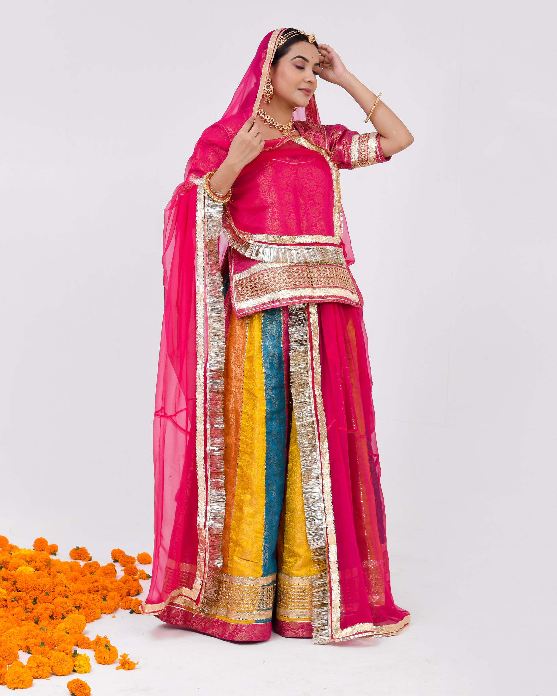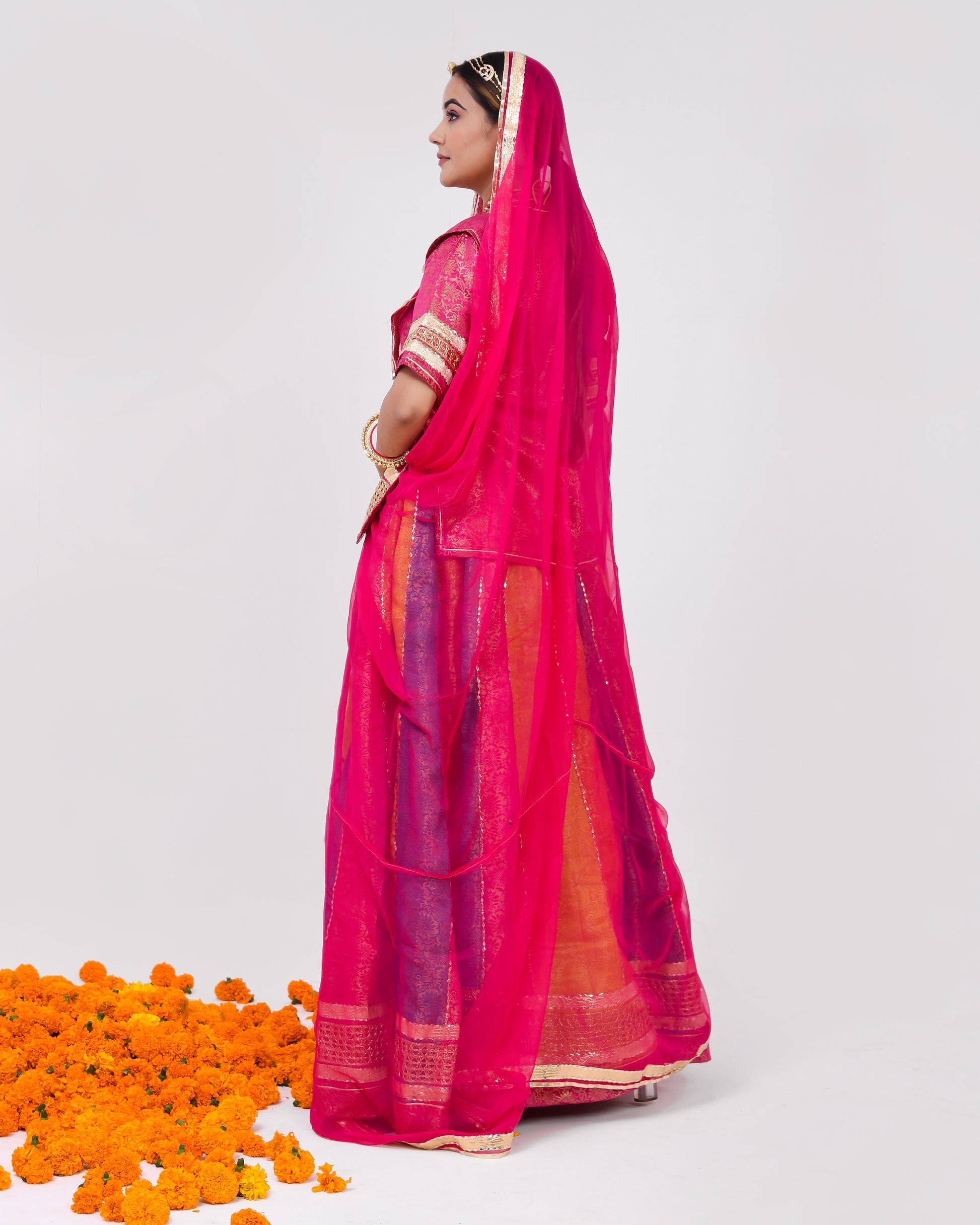 Introducing "Divyam," a celestial ensemble that encapsulates the essence of divine beauty and tradition. This multi-parcha 32 kali lehnga poshak, adorned with exquisite golden border work, invites you into a world of regal splendor. Each twirl is a dance of vibrant colors, and every stitch tells a story of timeless craftsmanship. Paired with a pure Thakurji odhna, meticulously designed with traditional motifs, "Divyam" is more than just attire—it's a sacred symbol of reverence and grace.