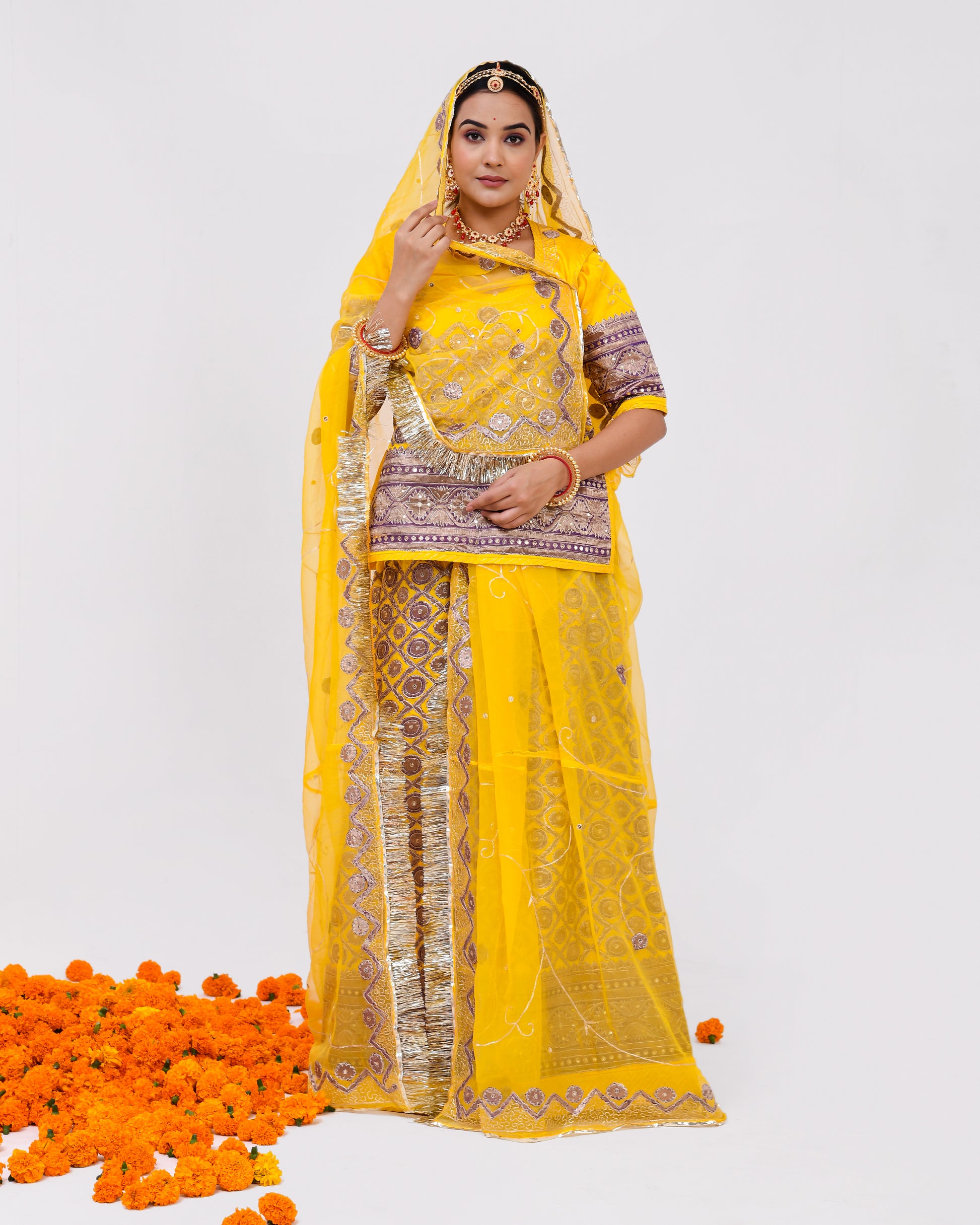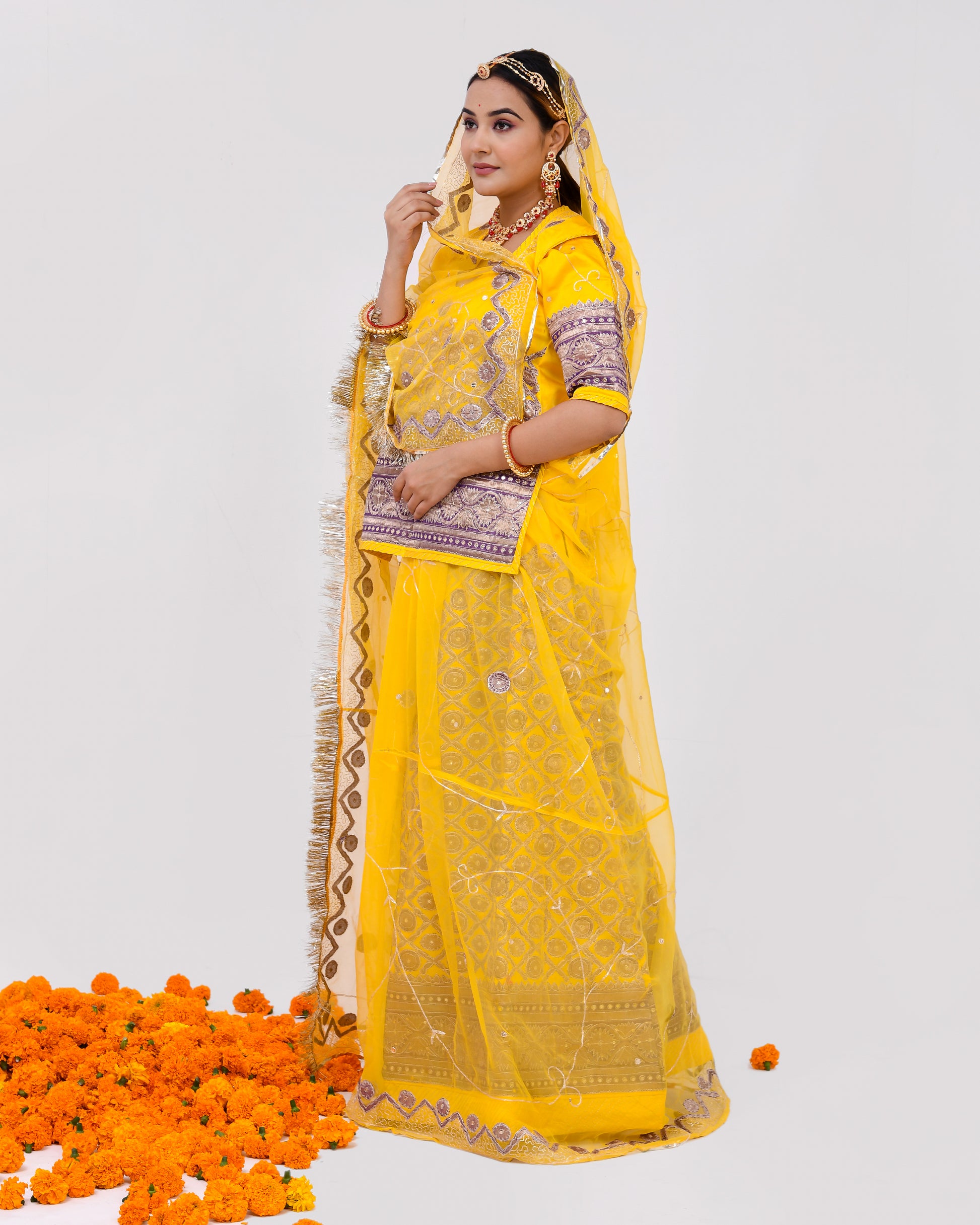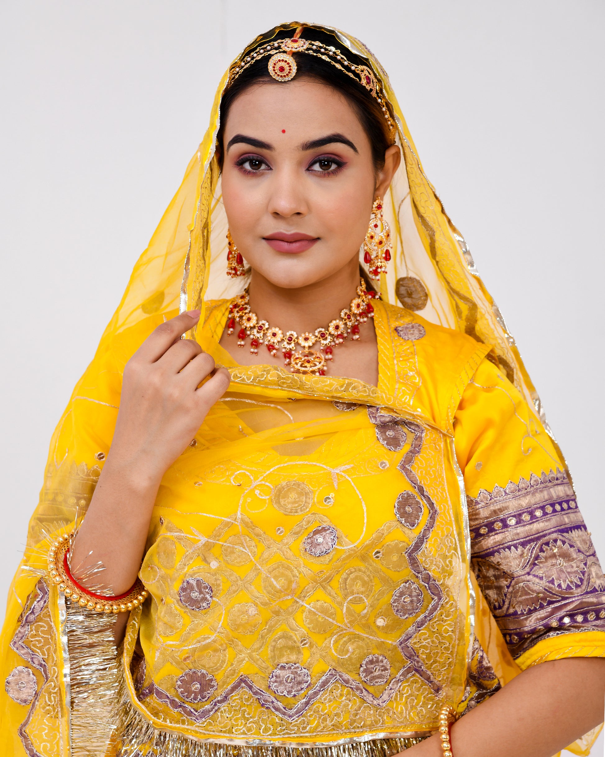Step into the elegance of Indian tradition with "Limonika" – a radiant lemon-colored Rajputi poshak that captures the essence of heritage and style. Crafted from exquisite Bamber satin fabric, adorned with delicate chanderi transfer work, Limonika is a masterpiece that embodies the vibrancy of Indian craftsmanship.