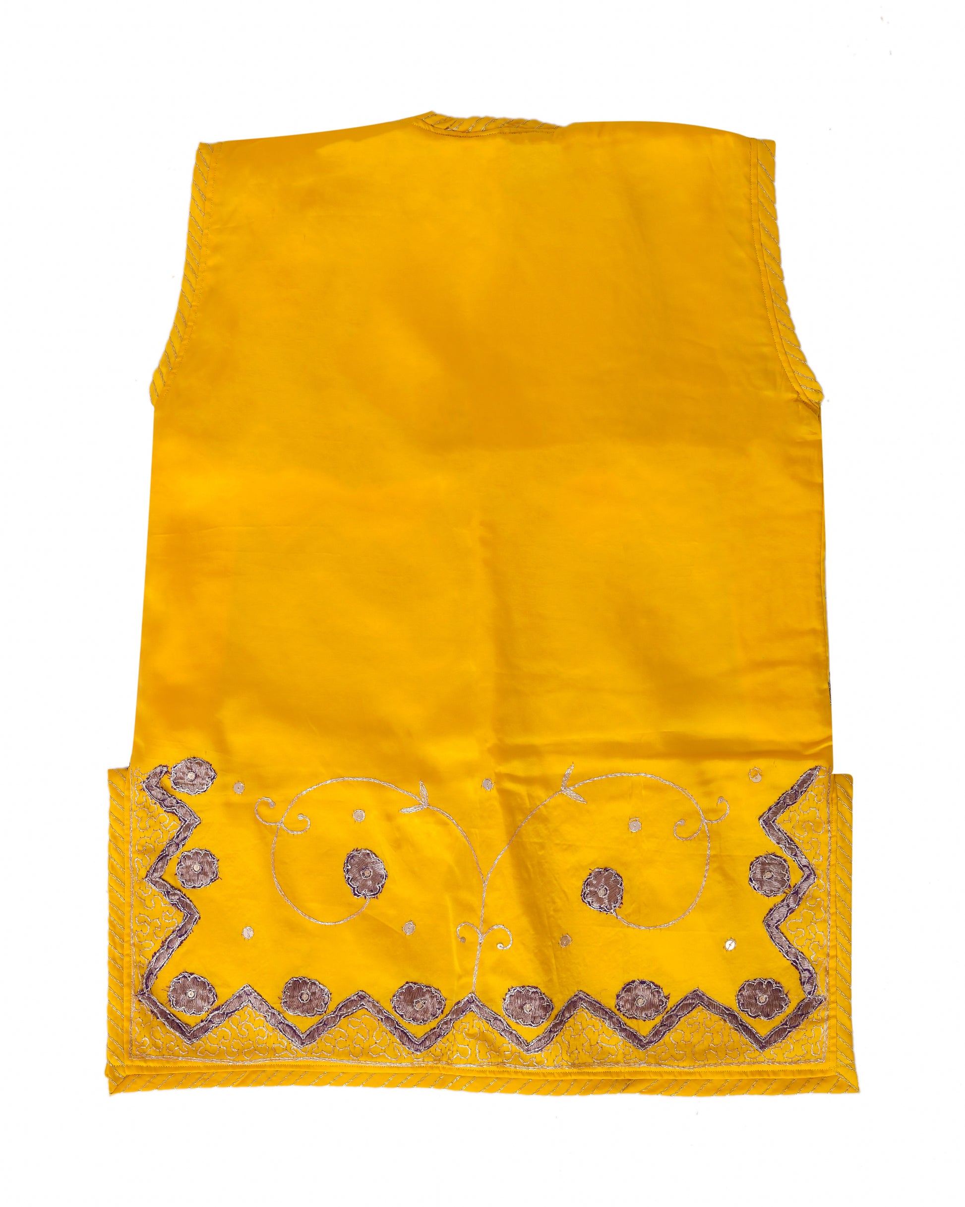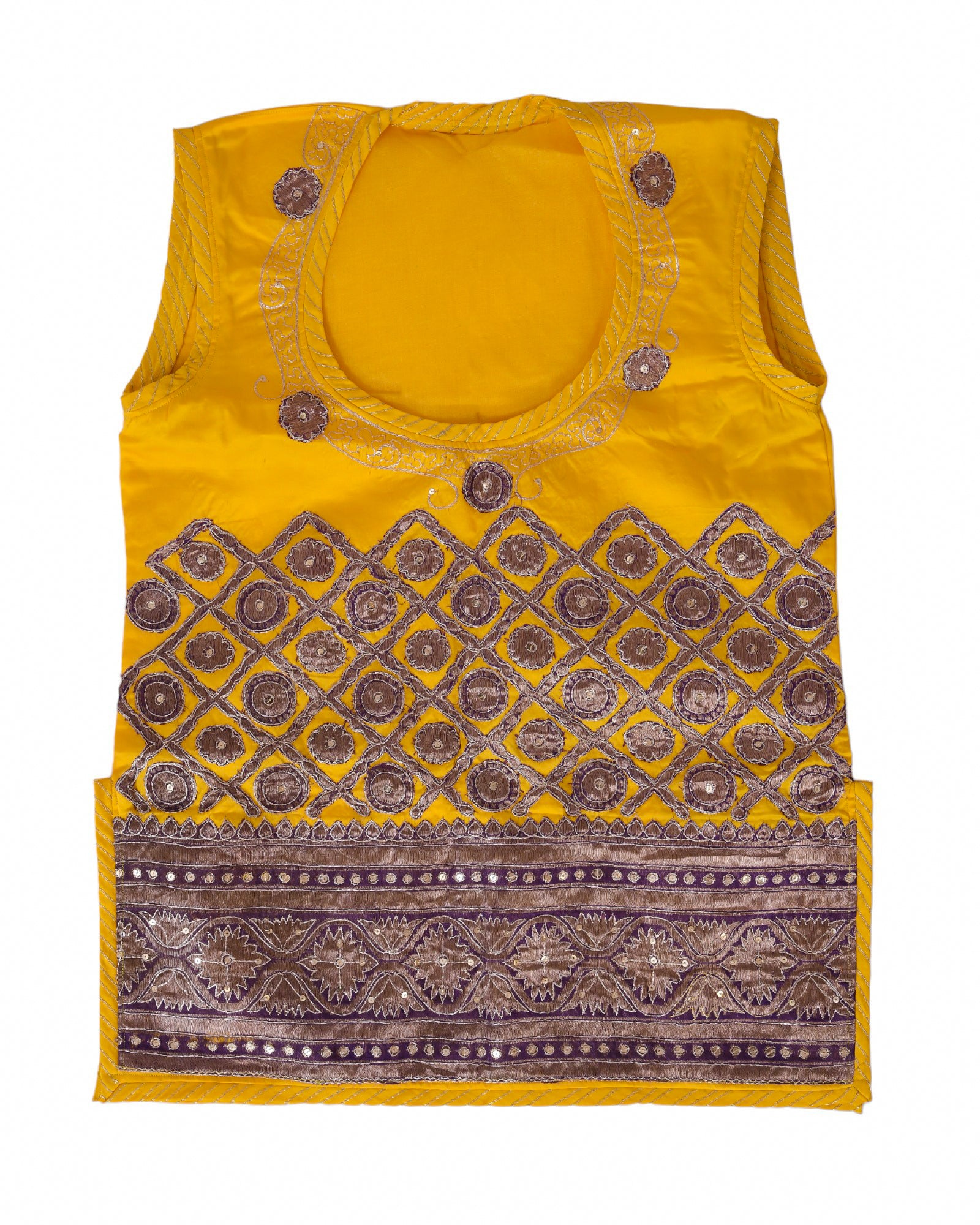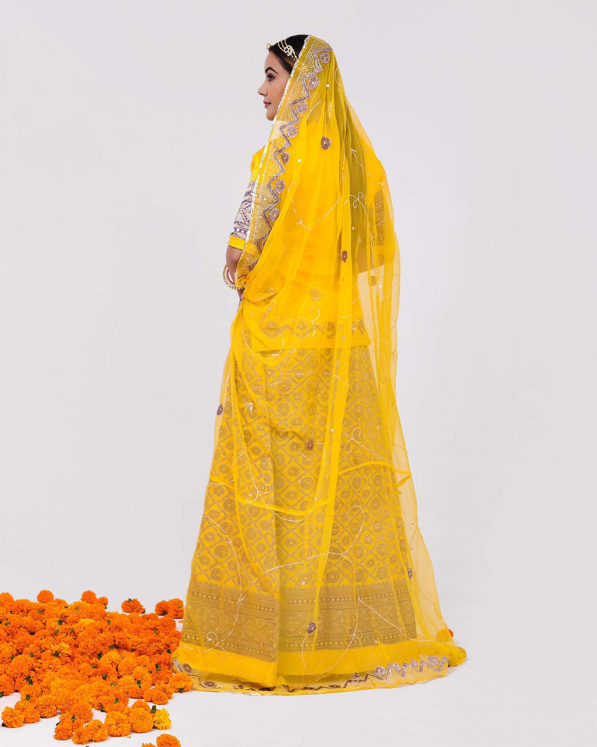 Step into the elegance of Indian tradition with "Limonika" – a radiant lemon-colored Rajputi poshak that captures the essence of heritage and style. Crafted from exquisite Bamber satin fabric, adorned with delicate chanderi transfer work, Limonika is a masterpiece that embodies the vibrancy of Indian craftsmanship.