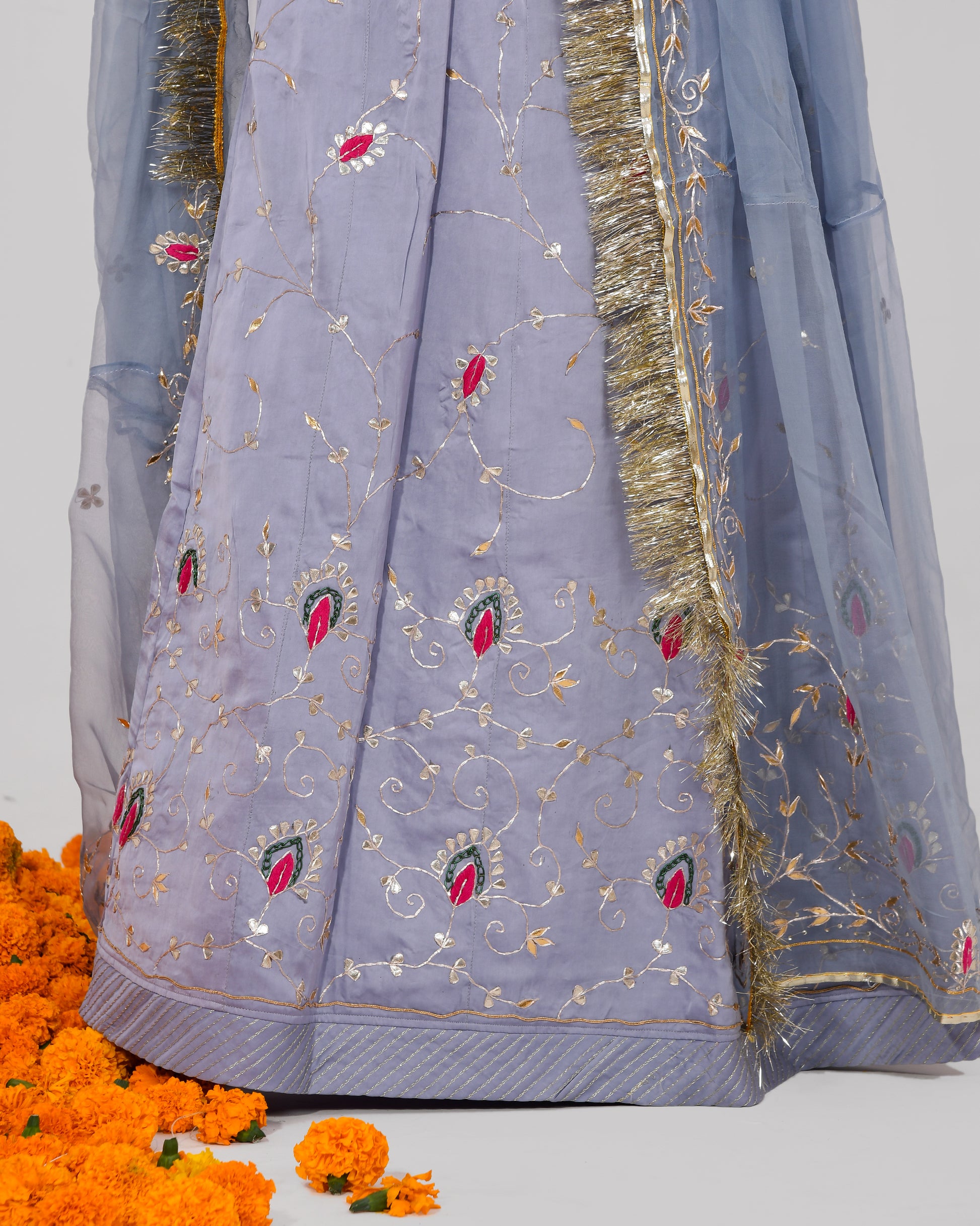 Step into the enchanting world of heritage and elegance with "Maniha," our exquisite Indian traditional ethnic poshak. Crafted from luxurious pigeon-colored Bamber satin, this masterpiece features intricate zero Patti handwork, adding a touch of regal allure to every thread. Immerse yourself in the fine artistry and timeless charm of Indian tradition, embodied in the rich hues and delicate craftsmanship of Maniha. Elevate your style with this resplendent ensemble, a true testament to the grandeur of our cultural heritage.