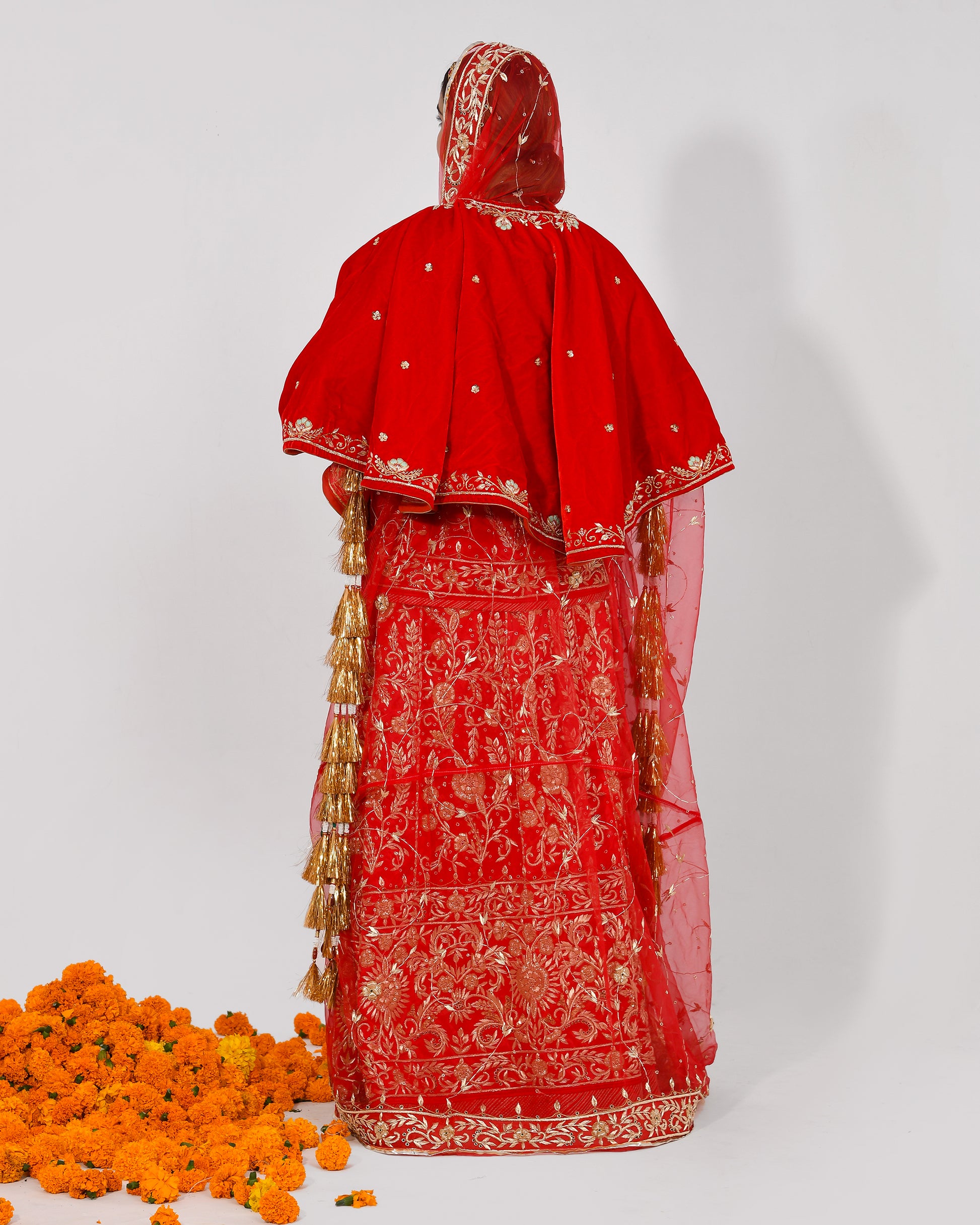 🌟 Hand-Embroidered Jardoji Work: Adorned with intricate hand-embroidered jardoji work, this poncho showcases the skill of master artisans. The meticulous embroidery, inspired by traditional Rajasthani craftsmanship, adds a touch of opulence, making "Reeva" a statement piece that captures the essence of royal elegance.