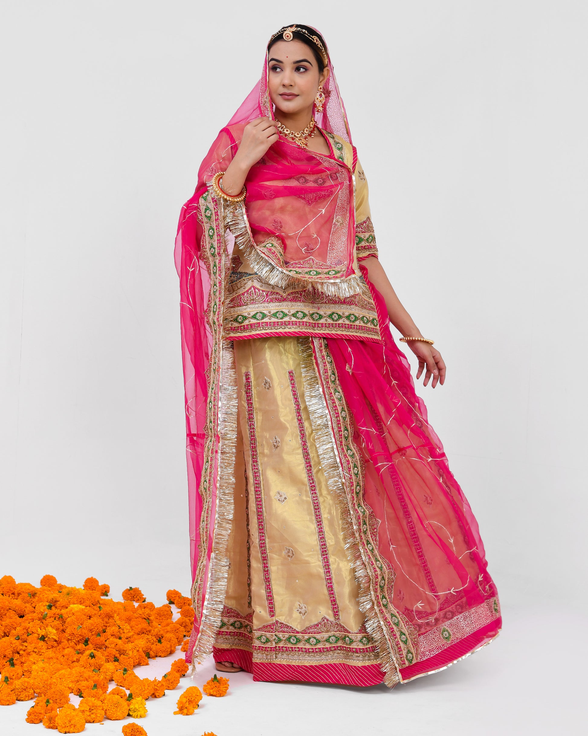 Step into the world of regal elegance with "Swarnika" – a resplendent golden tissue poshak adorned with intricate copper transfer work, complemented by a tamatari red odhna. This ethnic traditional ensemble is a celebration of opulence and heritage, designed for the woman who appreciates the finer things in life.