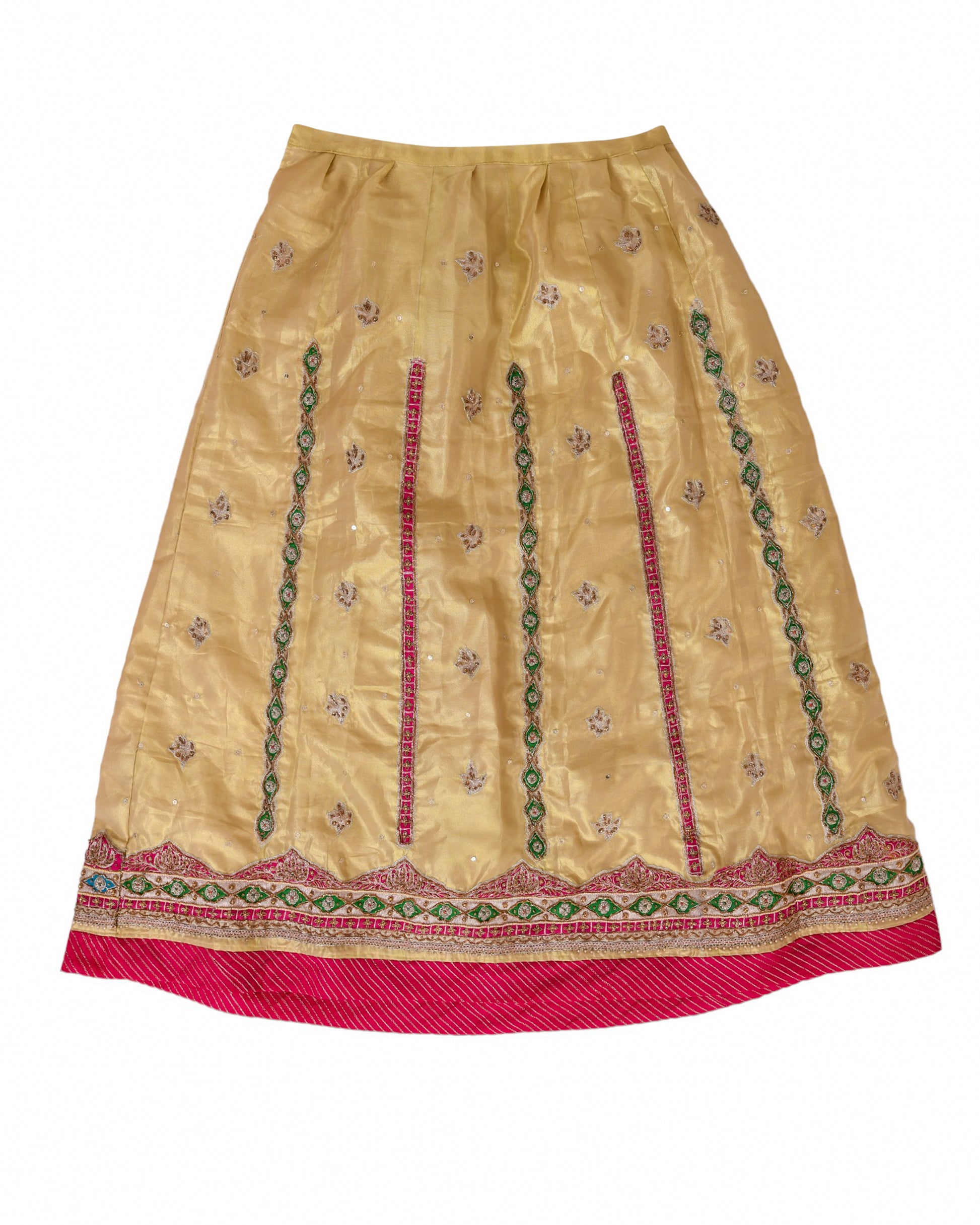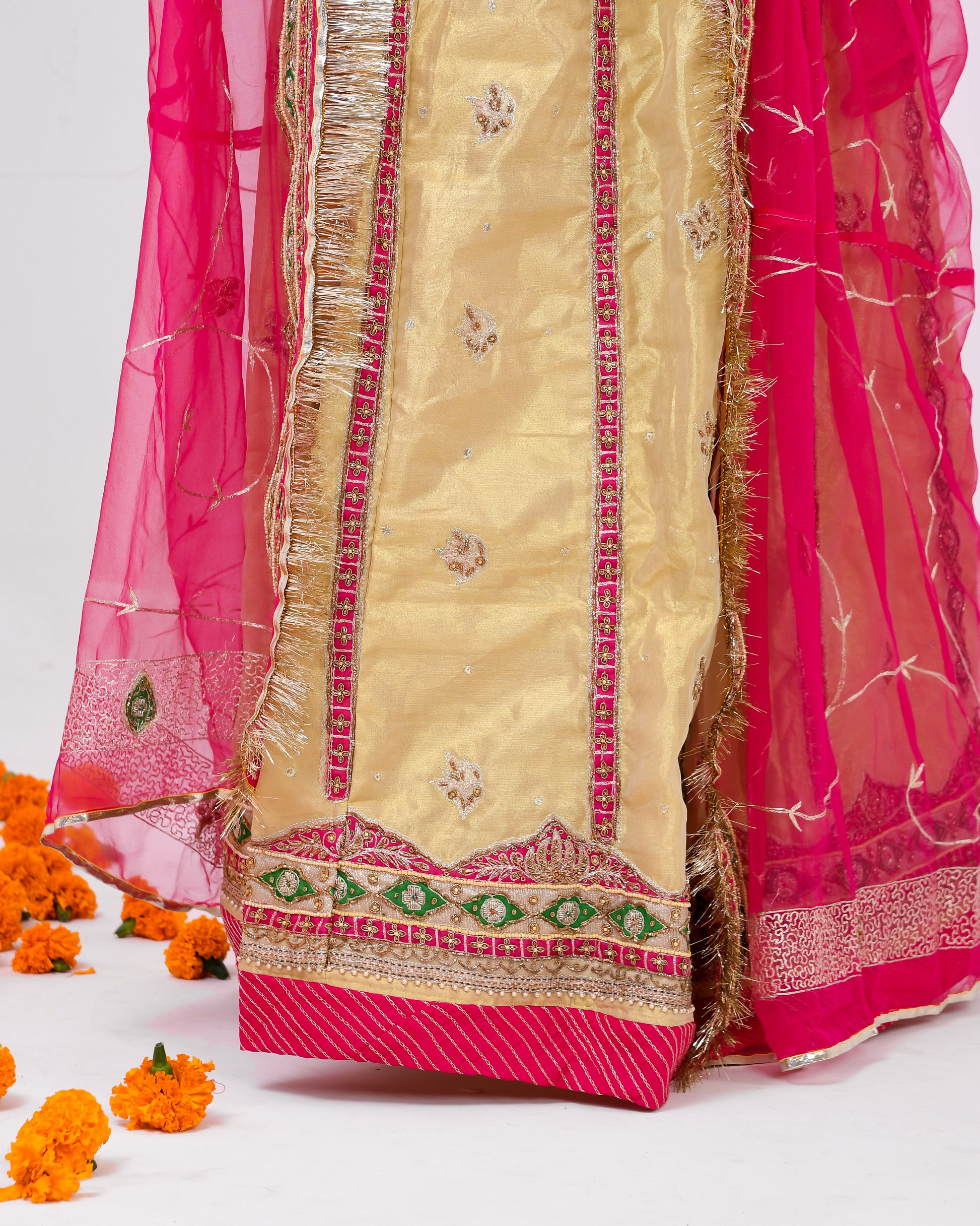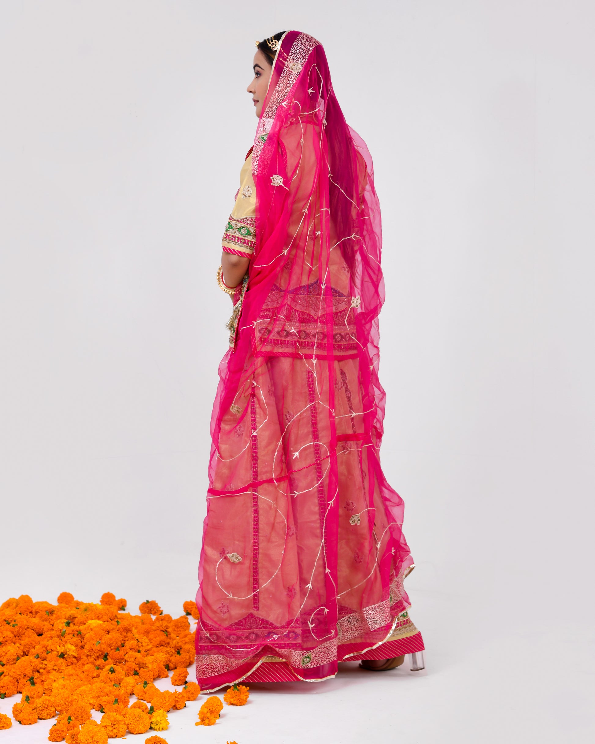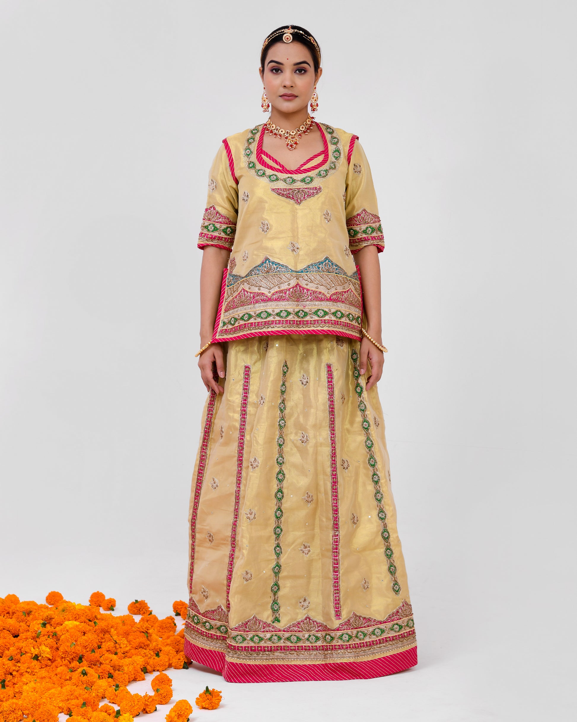 Swarnika, meaning "adorned with gold" in Sanskrit, is a testament to the timeless allure of Indian craftsmanship. Crafted from luxurious tissue fabric, this poshak gleams with the richness of gold, accentuated by the vibrant tamatari red odhna. The intricate copper transfer work adds a touch of sophistication, making Swarnika a true masterpiece of artistry and style.