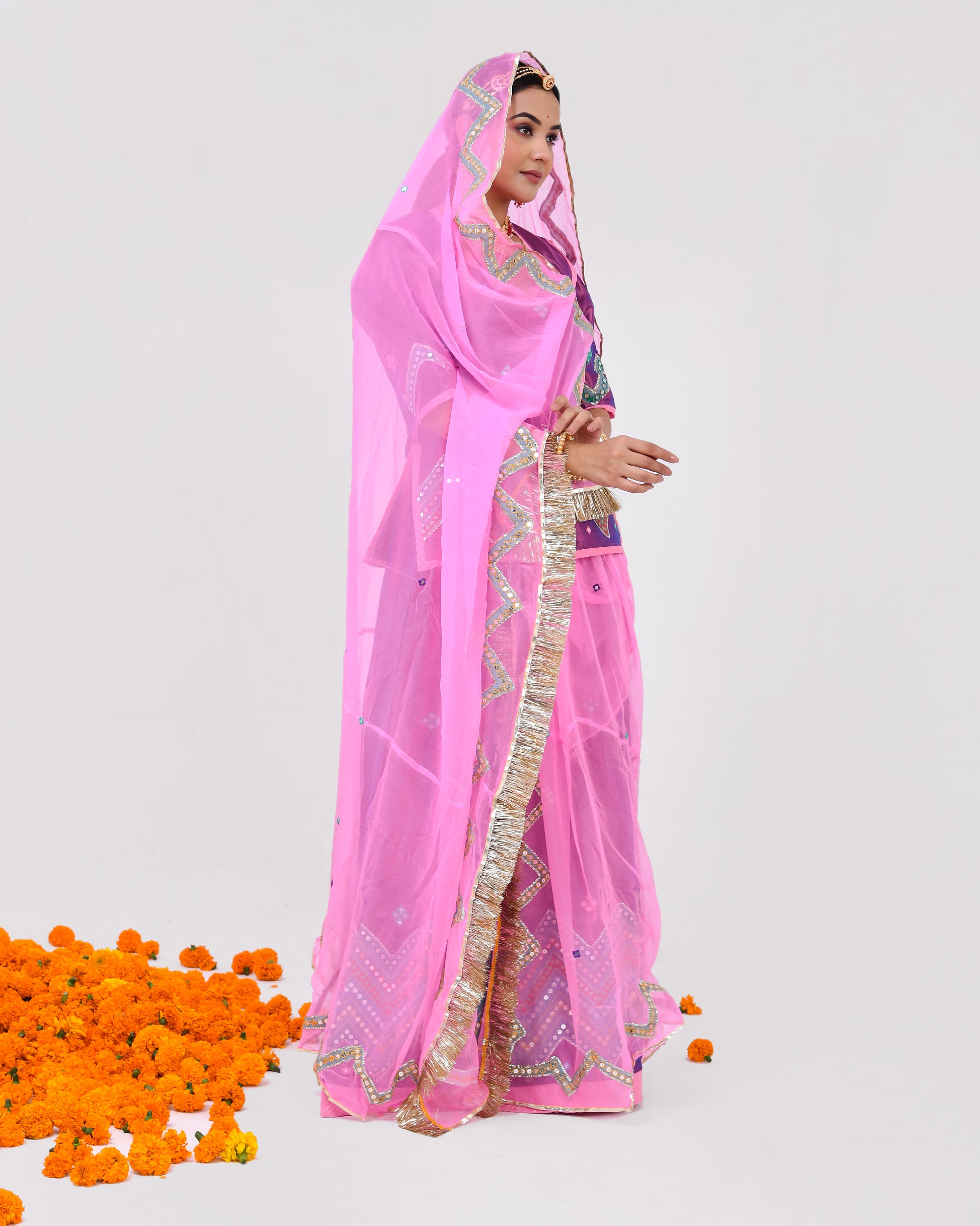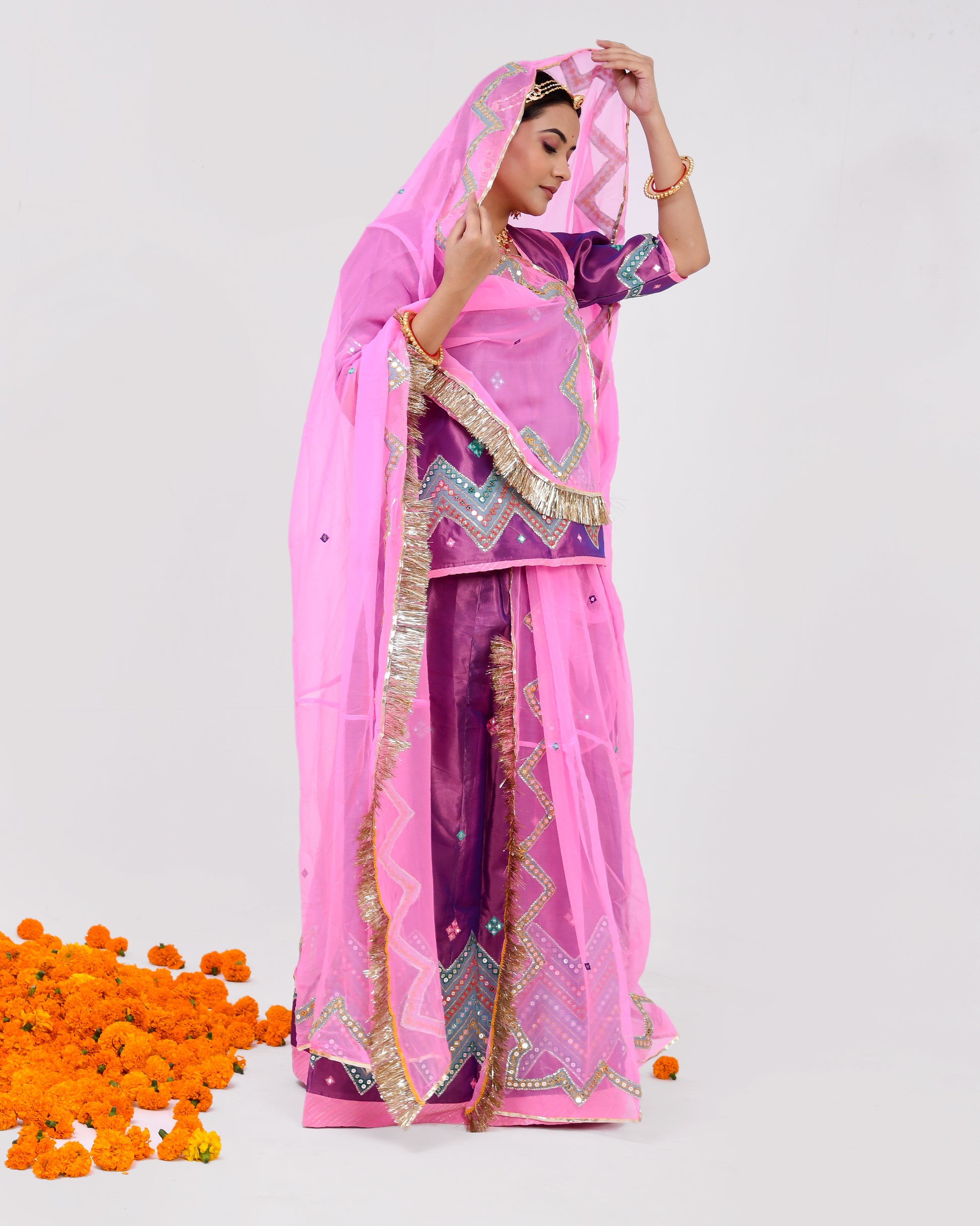 Elegance in Every Thread: "Varali" captures the essence of elegance with its delicate tissue fabric and meticulous mirror embroidery, each stitch reflecting the dedication of skilled artisans. The poshak drapes gracefully, emphasizing the wearer's grace and poise. The contrasting Thakurji odhna and magji complete the ensemble, adding depth and vibrancy to the overall look.